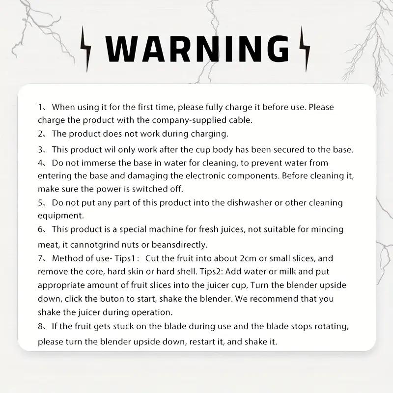 🛡️ Safe & User-Friendly for Every Age Designed with safety first!This portable juicer tumbler features a child-lock function-blending starts only when the lid is fully secured, preventing accidental activation.Made with food-grade BPA-free plastic, it’s non-toxic and safe for kids, pregnant women, and seniors.The one-touch operation is simple enough for anyone to use