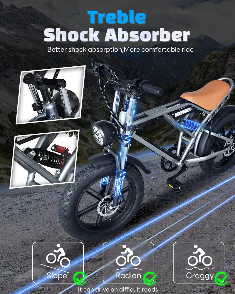 E-bike dual shock absorption system, fork damping and center damping synergistic, precise cushioning, deep filtering bumps, bring comfortable and smooth riding experience.